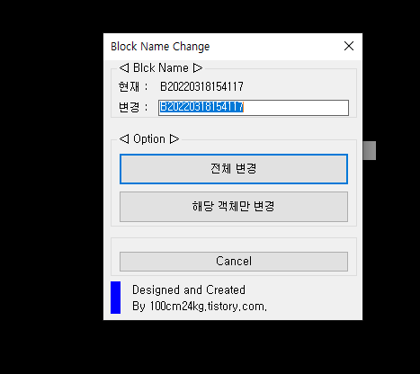 "전체 변경"은 선택한 블록의 전체를 이름을 변경하는 것이고 "해당 객채만 변경" 은 선택한 블록만 이름을 변경하는 것입니다.